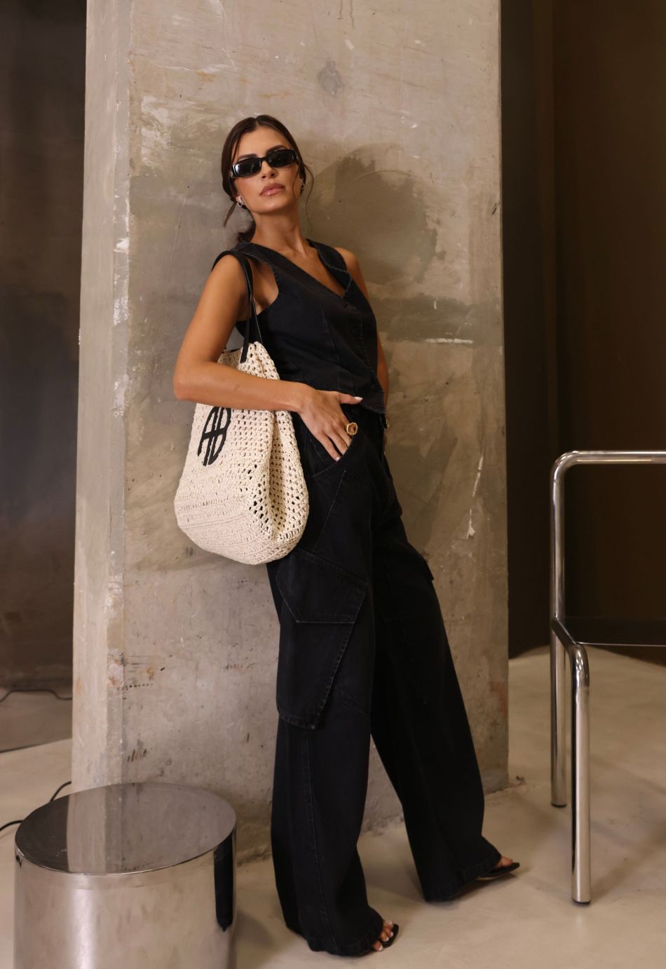 O colete Indie é a uma nova proposta de colete. A peça possui alças largas, pregas na frontal, fechamento por botão, modelagem de alfaiataria. A peça pode fazer conjunto com a super wide, perfeita para usar com salto fino e maxi acessórios.