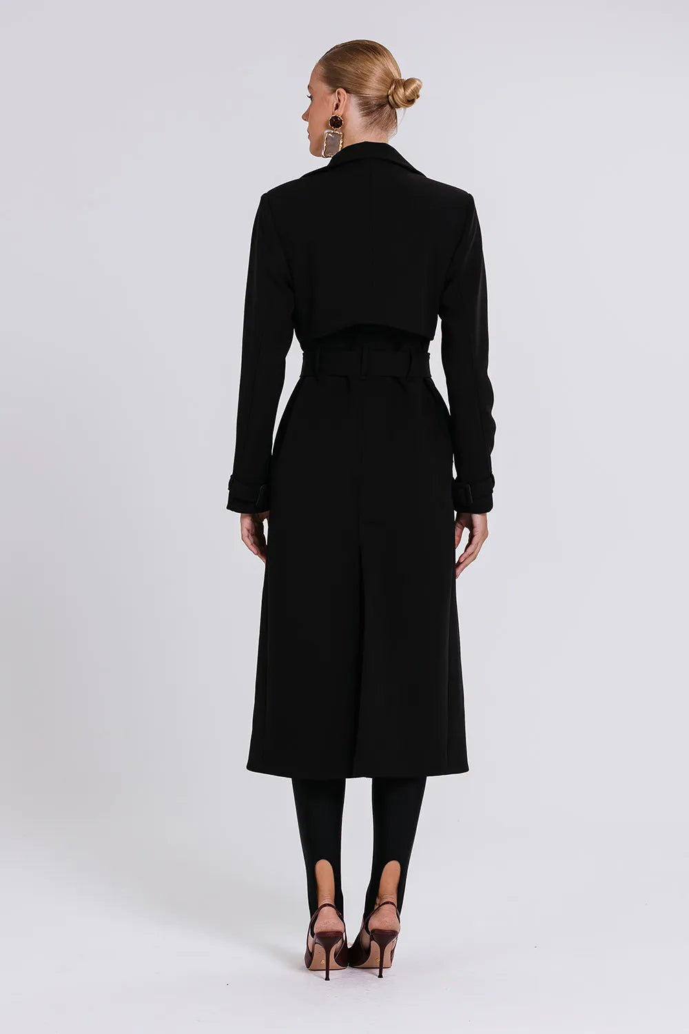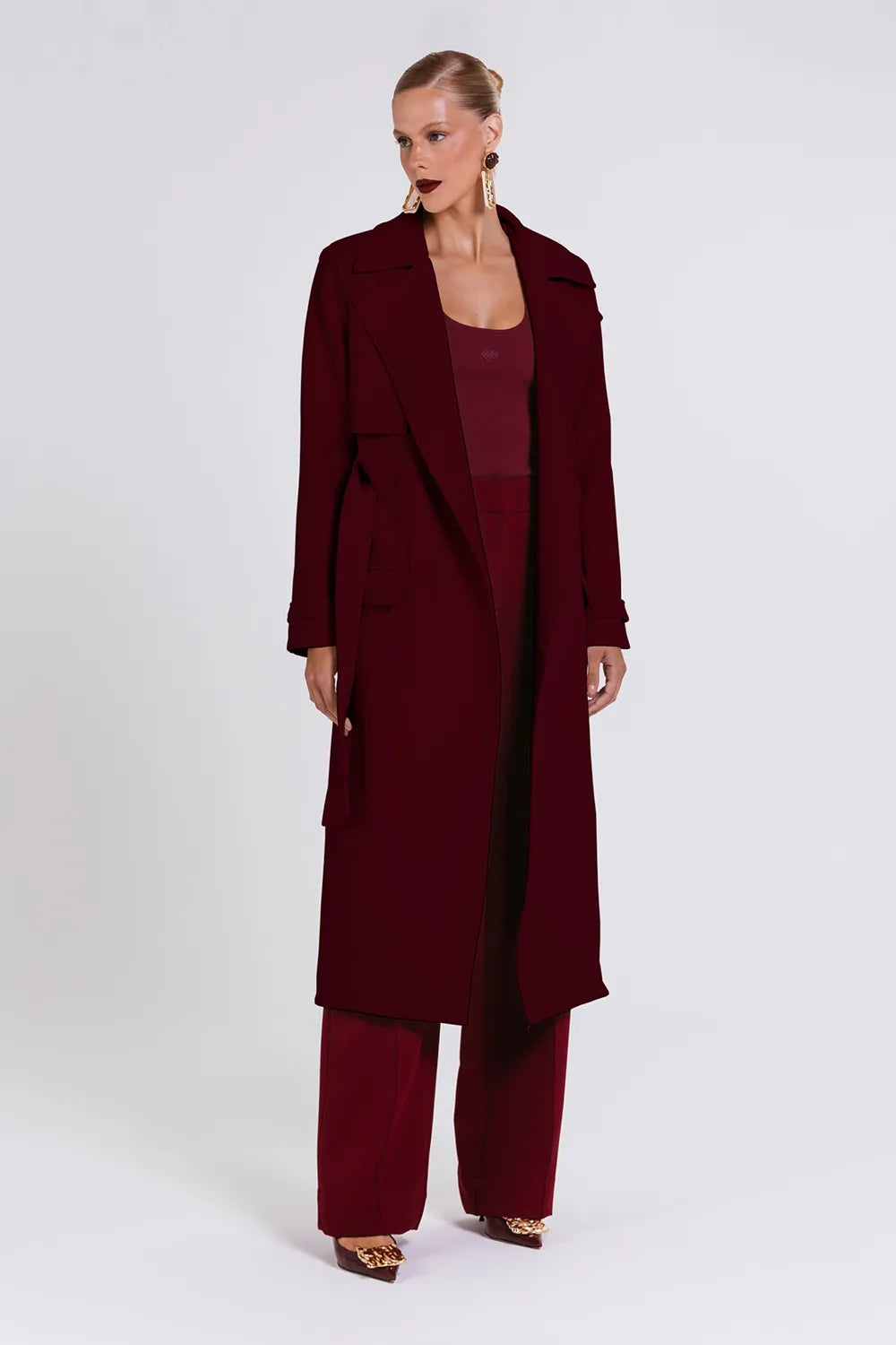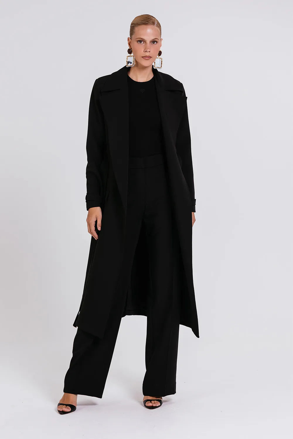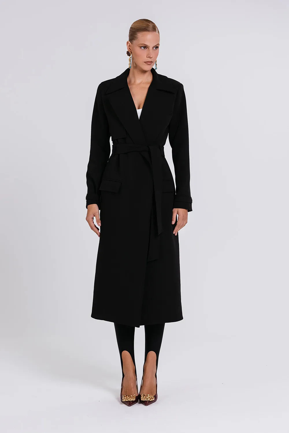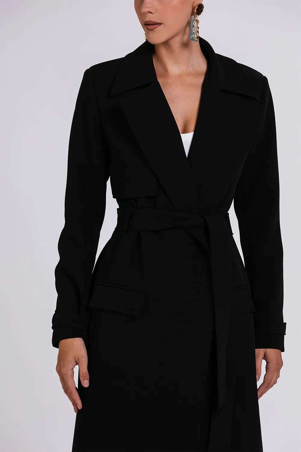 Crepe estruturado de toque suaveModelagem alongada Lapela amplaCinto do mesmo tecido para amarraçãoPunhos com fivela forradaBolsos laterais com abaEstrutura de alfaiataria imponente