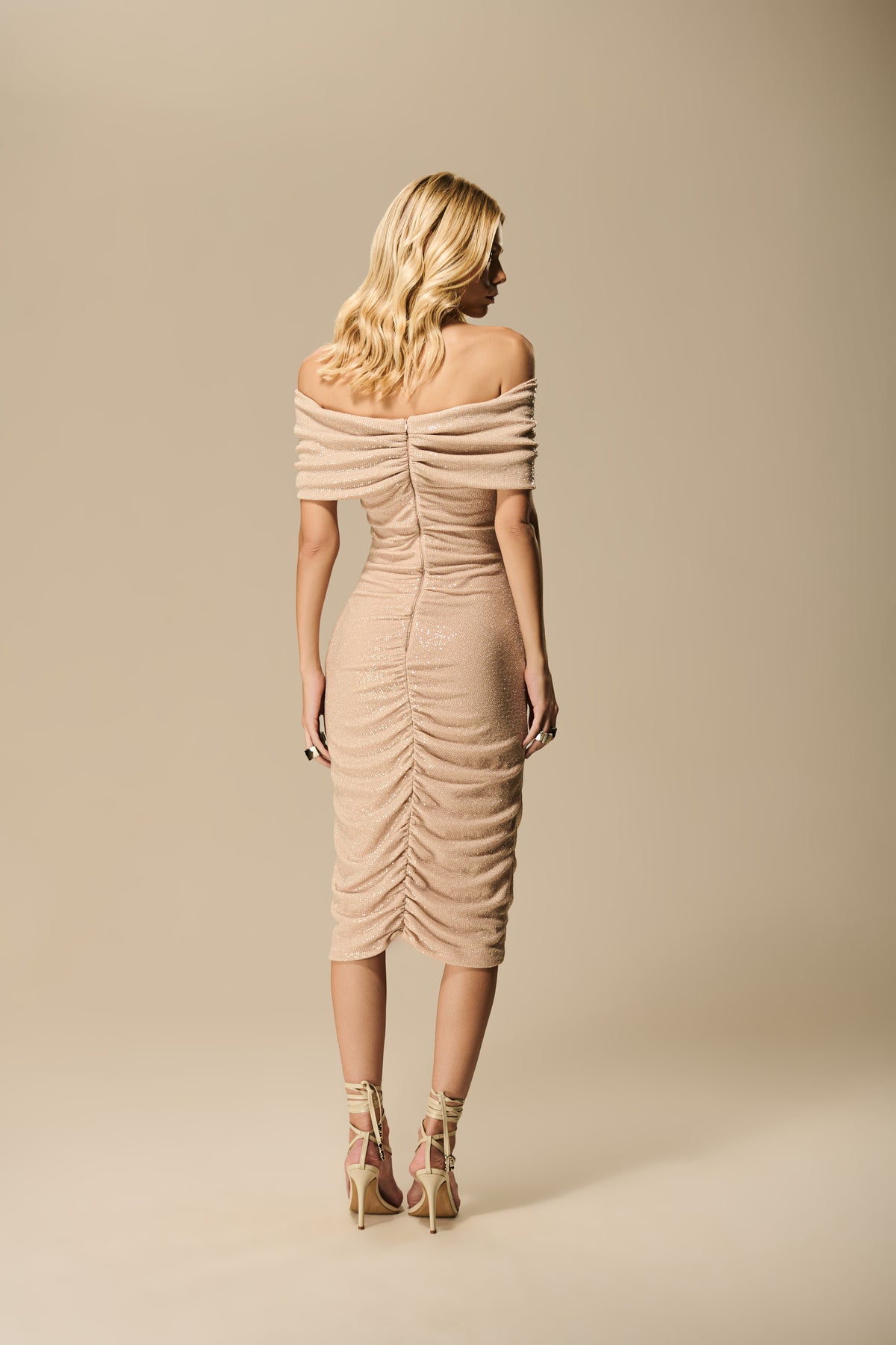 Minimalismo com presença. Este vestido midi ombro a ombro redefine o clássico com uma abordagem contemporânea e escultural. A silhueta ajustada é realçada por pregas estratégicas ao longo do corpo, criando textura e movimento enquanto valoriza as curvas com sutileza. O decote ombro a ombro revela o colo com elegância, equilibrando sensualidade e sofisticação.